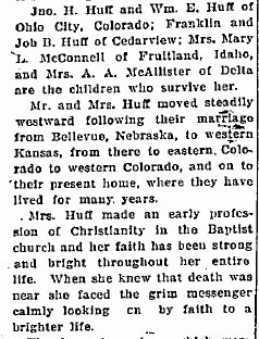 John Henry Huff 1868-1951 is buried in Delta, Colorado # 15494951. So is Ella Anna Huff 1874-1932, # 19779355