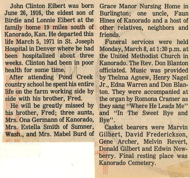 Mr. Eibert came to western Kansas in the spring of .1887 and fettled on a homestead where he has been a faithful farmer ever since. Mr. Ibert became ill some time