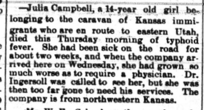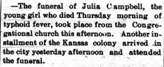 Wednesday, Oct. 10.--Just thirty days since we left home. This morning we left camp very early. Eight miles from Grand Junction. Mr. Oaks and myself went on ahead in a cart to hunt camping ground at Grand River, as Julia Campbell is getting worse all the time. We all got to Grand River about 10 o'clock, here we called a doctor and he said that she had the mountain fever and was dangerously ill. So we found a room and took her there. Frank Cummings and I carried her up stairs and I Could see that she was past cure, in my belief. We went down Grand River 2 miles to get camping ground. This evening I went up to see her and she was a great deal worse. Thursday, Oct. 11.--Still laying here in camp on the Grand River. This afternoon we got word that Julia was dead. She died at half past ten this morning, so Messrs. Oaks, White, Pilling and myself went to dig her grave. We did not get it very deep as we had to dig through gravel and rock. This young lady was fourteen or fifteen years old. She leaves a mother and three sisters, of whom all are older, in our Colony. She will be buried here tomorrow at 2 o'clock. Friday, Oct. 12.--Still in camp near Grand Junction. Very nice weather. Frank Cummings went back at midnight last night to hunt the balance of our Colony, in order to get Mr. Dreisback to preach the funeral. He found them about eight miles back and got them out and they hitched up and pulled into our camp at daylight this morning, so at present we are all together again, except Trickett, Skeen and Crossman, they got in a hurry and left us some over a week ago. The funeral services were held at the Congregational Church today at 3 o'clock. Rev. Dreisback preached the funeral. Mr. Oaks has two or three children sick and it is thought that they have the mountain fever. We went to the Seminary, a distance of two miles, there was two wagons and a buggy. It was dark before we got back to camp. Julia belonged to the United Brethren Church An obituary was in the Grand Junction News page 4, October 13, 1894 THANKS TO THE MESA CoUNTY PUBLIC LIBRARY