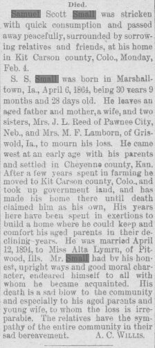 If this is the same Samuel, his brother David was in Jewell County in 1922 " Hays Kansas, Free Press March 16, 1922: THE DEATH OF MRS. WILHELMINA WAGNER Mrs. Wagner died soon after the noon hour on Friday, March 10th, inst. She had completed her 70th year on February 26th last, having survived her husband, Mr. Jacob Wagner, ten years. Grandma Wagner as she was familiarly known, lived the quiet unobtrusive Christian life, devoted to the happiness of her family, her grandchildren, and all who were dear to her by the ties of close friendship. When in her usual health, she was bright in social intercourse, joined heartily in the social gatherings of her friends, and in their excursions. Her vacant chair will awaken sad reflectons, withal many cheerful memories of happy days, which will return no more. "Her children will rise up and call" her blessed;" their names follow here: Mrs. David Small of Jewell county; Mrs. Henry Rieff of Wa-Keeney; Mrs. William Bellman, of this city; and Miss Freda, at home, this city; and her three sons: Frederick J., William and Jacob. The funeral services were held at .the Lutheran Church, conducted by the pastor; the floral tributes were lavish and beautiful, contributed Ty the Normal Faculty, the High School teaching staff, and other close friends many of them of twenty years standing.For these and for the kind offices of all who gave generous and needful ministrations at the home, the heartfelt thanks of the family are extended." February 2015 Roseburg, Oregon "Mildred West was born July 20, 1919, in Montrose, KS, the youngest daughter of Emma (Wagner) and David Small. At age of one year, they moved to Superior, NB, where she graduated from High School and then attended business School in Kansas City, KS. She worked for Armour & Co. for a number of years before moving to Oregon, where she met and married George West. " |