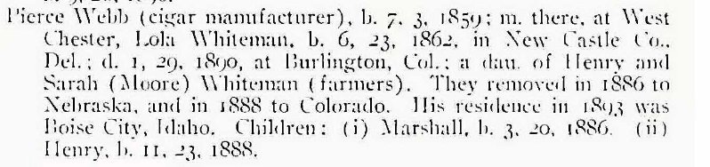 Marshall Baily was born in March 1886 in Colorado (exact town is not certain). His parents were Pierce W. Baily and his wife Lola (Whiteman) Baily. His parents already had a daughter, Minnie Whiteman, born in August 1883, but she had been left in Delaware with her maternal grand-parents while her parents went to "seek their fortune" in Colorado's silver boom of the 1880s. Unfortunately, complications following Marshall's birth were too much for the health of his young mother. Lola Whiteman Baily died shortly after he was born and was buried in Colorado; the exact location remains unknown. His father and young Marshall eventually returned to Pierce Baily's home state of Pennsylvania. They lived in Chester, Delaware County, Pennsylvania, a few miles from Pierce's family home in Kennett Square, PA. The family were Quakers. Pierce W. Baily was a crane operator and eventually a foreman at a local coke ovens manufacturing company. Apparently, he re-married in Pennsylvania as his death certificate (1909) was signed by an "Anna Baily" and he was listed as "married". |