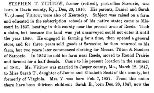 In 1860 Jasper County, Missouri, Stephen Vititow is 43, farming, born in Kentucky, with Sarah 33 Virginia, Sarah E. 12, James D. 10, Ellen F. 9, Kate 8, William T. 5, Fanny 3, and Stephen 1, all kids born in Missouri.