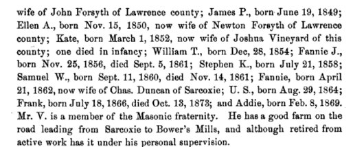 Wiliam T. Vititow is in Grant County, Oklahoma in 1900, born December 1855 in Missouri, living with sister Sara Forsythe, Sarah Dec 1848 is married to John Forsyth May 1841 Tennessee. (John died in 1902 and is buried in Jasper County, Missouri. #55018822_
