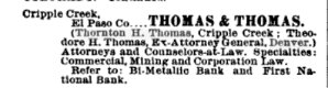 In 1900 Thornton is in Teller County, Colorado in 1900, a lawyer born Feb 1851 in Kentucky, with Lizzie M. Dec 1856 Arkansas, and Thornton Jr. Otober 1897 Colorado.