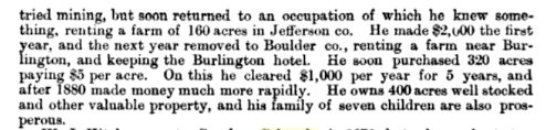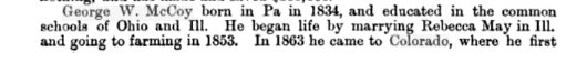 George W. McCoy was born in Ohio, December 3, 1835, was married in Decator, Illinois, to Rebecca May, in March, 1854, nine children having been born to them. In March, 1873 he came to Colorado, settling in Arvada, his family joining him in May of the same year. They came to Longmont in November of 1874, where the family lived until January, 1897, when they removed to Ordway. He leaves a wife, five daughters and one son. George's daughter Abbie Elizabeth (McCoy) Manners 1857-1933 is buried in Longmont, # 60873259. Norma Belle (McCoy) Corbett 1859-1920 is buried in Longmont, # 60879415. Dora L. (McCoy) Eveland 1868-1893 is buried in Silex, Missouri, # 98337514. "In Denver, Wednesday evening, Oct. 5, 1898, at 8 o’clock, Arthur E. Slifer of Longmont and Miss Gertrude A. McCoy of Ordway, Colorado." Gertrude Slifer 1877-1945 # 125286681 is buried in Twin Falls, Idaho, with Arthur E. Slifer 1875-1956. |