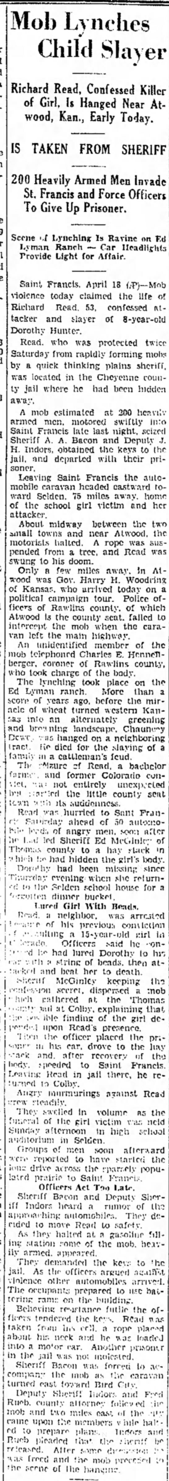 April 21, 1932 "RICHARD READ HUNG BY KANSAS MOB