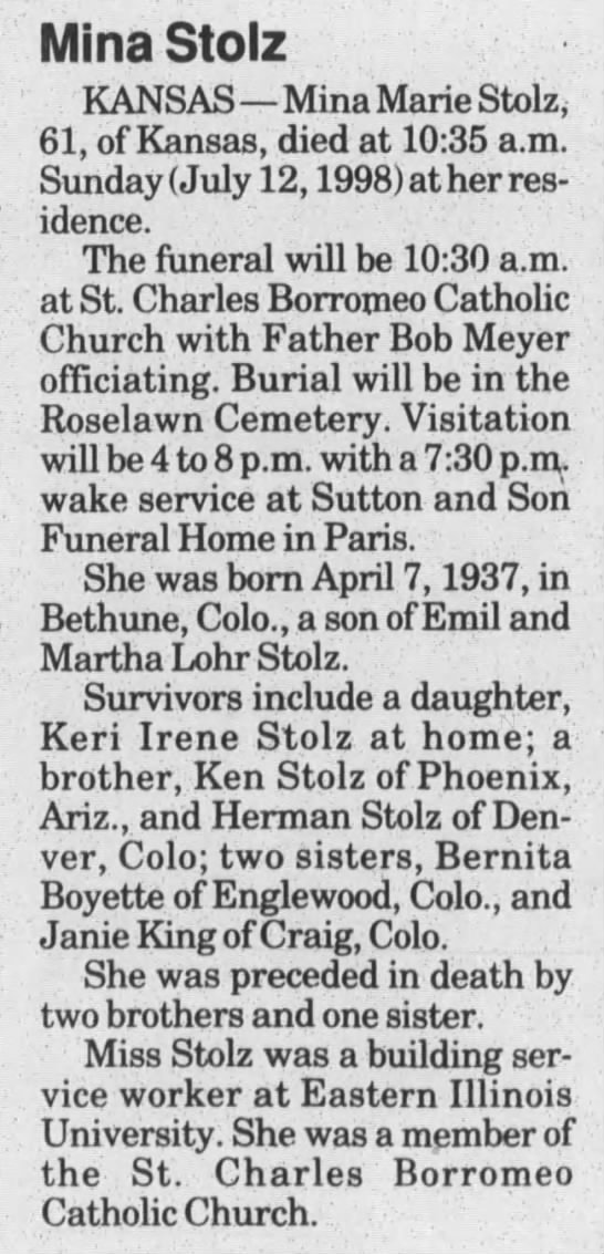 He was preceded in death by his parents, Herman and Emma Stoltz, and four brothers: Frank, Emil, and Henry and Paul.