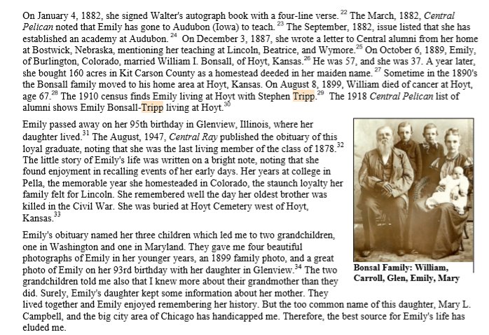" In June 1878, Emily graduated from Central College in Pella.20 Back issues of the Central Ray are a valuable source for information on Emily, as her name is found many times in succeeding issues. She was a loyal alumna. The October, 1881, issue says she will teach at Silver Grove the coming winter. "