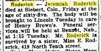 "Looking for anyone with a RODERICK connection. Jeremiah M. Roderick, b.Sept 1856, immigrated from U.K. in 1889 with his son William G., b.Sept 1879. Jeremiah's older brother, John Roderick, had preceded him to Bennett, NE. Jeremiah and William lived in Bennett and in Palmyra. William had two brothers who immigrated to Canada in 1910 and 1919"