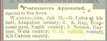 Seibert history "two general merchandise stores, one run by Kate and Leander Hutchens and the other by \ Arenscheild and South; a hardware store operated by Mr. Scheib; "
