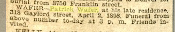 Patrick Wafer, 1867 - Apr 1898 is buried in Fairmount Cemetery