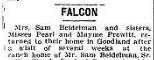 February 1904 Falcon, Colorado news items "Mrs. S. Beidelman, who has been ill for some time, was taken to Roswell Wednesday, and is reported much better.