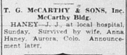 1921 Aurora, Colorado "Mrs. Agnes Haney is now making her home with her son. Mr. F. C. Haney."