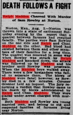 When Ralph Samuel Madden registered for WWI in Norton, born August 8, 1876, farming, his nearest relative was Velma Vera Madden of Logan, Phillips County, Kansas.