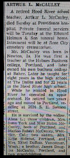 James Douglas McCauley registered for WWII in Portland, Oregon, born May 3, 1892 at Flagler, COlorado, with wife Grace L. McCauley.