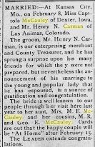 August 18, 1911 Las Animas, Colorado "Mr. and Mrs. J. M. McCauley, of Dexter, lowa, parents of Mrs. H. N. Carman and Mrs. J. M. Baldwin, after visiting here a lew days left Thursday morning for Cripple Creek."