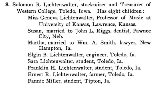 In 1870 Cedar County, Iowa, Solomon Lichtenwalter is farming, 30, born in Maryland, with Fanny 28 in Pennsylvania. Eva C. 3, Susan R. 1 and Minne two months were born in Iowa.