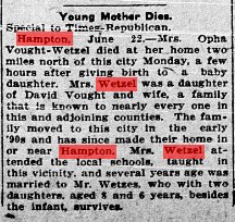 In 1900 Hampton, Franklin County, Iowa, Opha, born December 1879 in Iowa, is with David Vought born March 1897 in Illinois, married 25 years to Alice July 1852 Illinois. Nellie June 1877 was born in Illinois, Opha 20 and Lucy October 1883 in Iowa.
