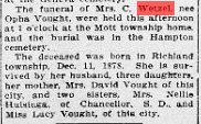 Opha Grace Vought and Christian Wetzel had Alice Lucile Wetzel on May 19, 1909 at Williamsburg, Iowa County, Iowa.
