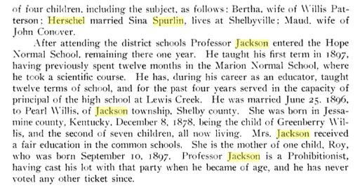 There's a Herschel Jackson registering for WWI in Shelbyville, Indiana, born Nov 25, 1879, a clerk for Otto Kuth Fur Co of Shelbyville, wife Sina May Jackson.
