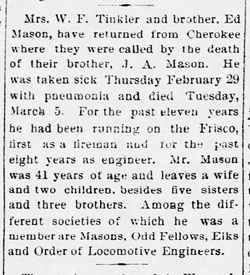 He was born in Hancock County, Ill., Dec. 14, 1871. When quite young he came to Rice County, Kansas with his parents. Later they moved to Norton County. He came to Cherokee in 1892 and has lived here since. He was married in 1894 to Laura Frances Lynn. To this union two children were born, both of whom with his wife survive him. Six sisters and three brothers also survive. His father and mother recently died. Five sisters and two brothers were at the funeral services, also Mr. J.N. Lynn, a brother of Mrs. Mason's and two cousins from Cherryvale.