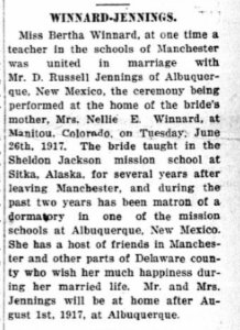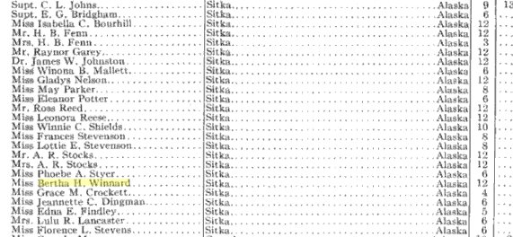 1912 "As a result of meetings held by the Stephens brothers last summer, twenty-five united with the Church at Manchester, Iowa. Twelve have signified their wililngness to go to foreign fields. Miss Bertah Winnard, a member of this church, is matron of the Sheldon Jackson School in Sitka."