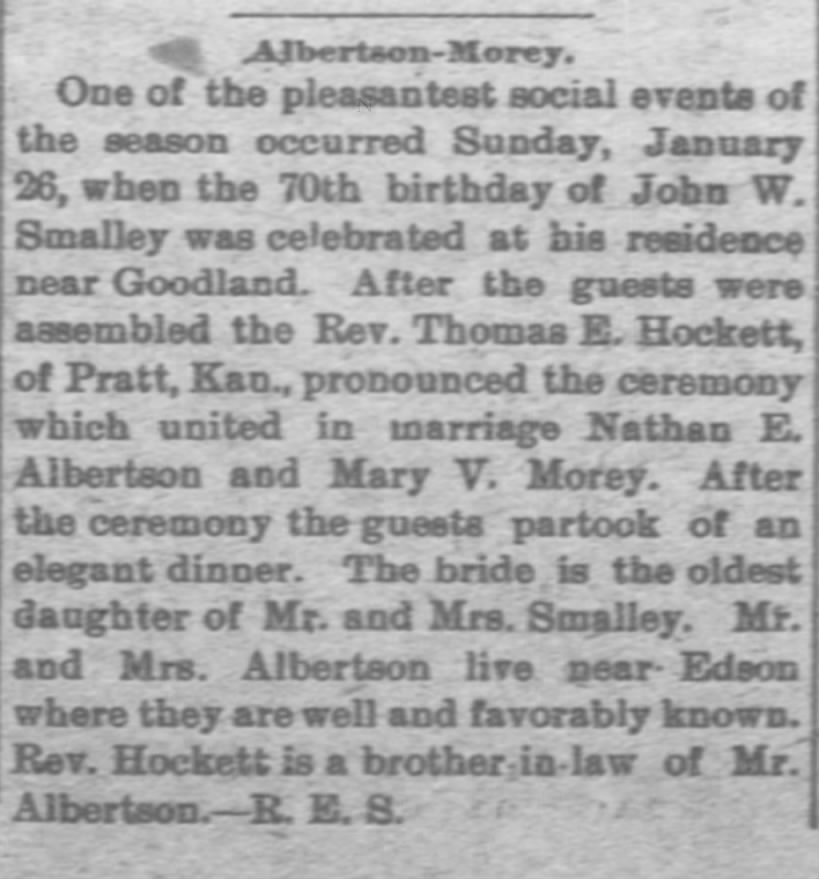 "She moved to Rawlins County, KS in a covered wagon from MO with her parents and was one of a family of pioneers in Northwest KS. She made her home in CO since 1939. She married Albert W. Smith on April 15, 1903, to this union two daughters and two sons were born. Albert passed away May 19, 1911. She married Calvin B. Albertson Januuary 1, 1916 and to this union three sons and one daughter were born."