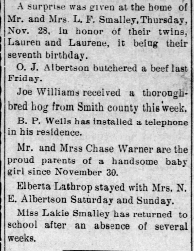at the home of her parents, Mr. and Mrs. William Albertson. Mr. Albertson returned from Meeker,