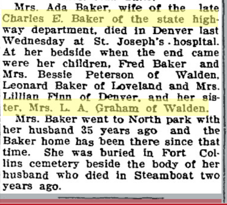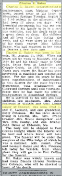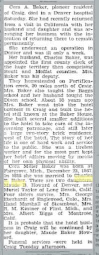 In 1900 Routt County, Colorado, Charles E. Baker is farming, born September 1862 in New YOrk, married ten years to Coar A. Dec 1868 Michigan. Maude S. April 1890 in Colorado, and farm laborer George Thurston June 1867 in Indiana.