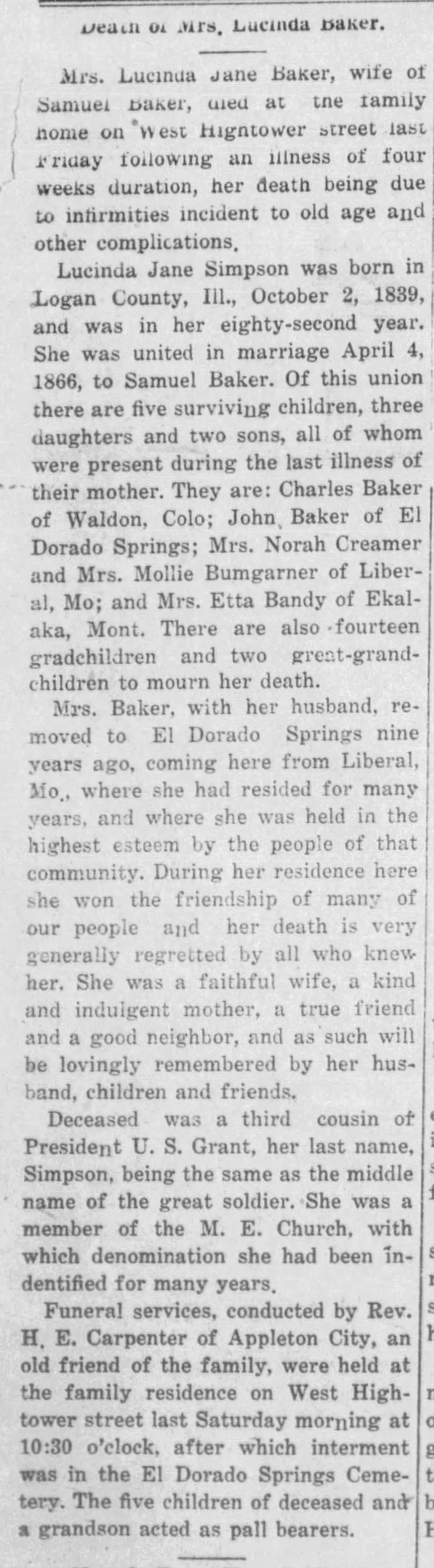 Samuel Baker, born December 12, 1838 in Ohio, a farmer, died in Eldorado Springs, Missouri on March 4, 1924, to be buried in the city cemetery.