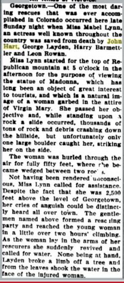 July 1884 Georgetown, Colorado "John Hart met with a queer accident at the