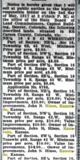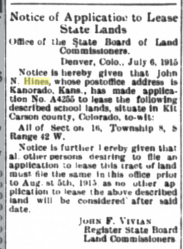 Faun Clesson Hines registered for WWI in Kit Carson County, living in Kit Carson County with a mailing address of Kanorado, born October