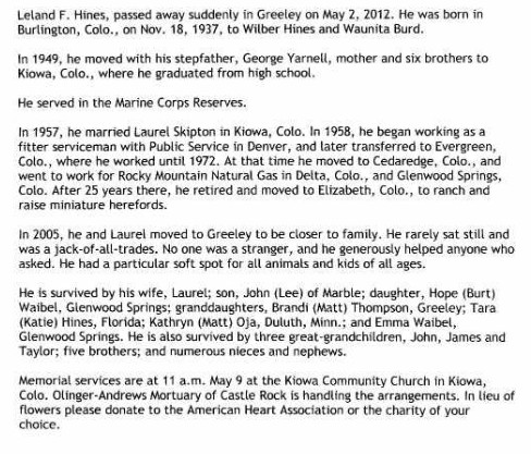 Survivors are his loving wife of 56 years, Irene, daughter LeAnne Hines of Lafayette, Colo., son David Hines of Elko and granddaughter Licia Hines of Edmons, Wash. Brothers: Bill Hines of Ft. Lupton, Colo., Mickey (Gerry) Hines of Huson, Mont., Leland (Laurel) Hines of Greeley, Colo., Norman (Carolyn) Hines of Elko, Donald (Ramona) Yarnell of Greeley, Colo., Larry (Ellen) Yarnell of Morrison Colo., Dale (Glenda) Yarnell of Ramah, Colo., sister in law, Sharon Mize, Elko, and many nieces and nephews."