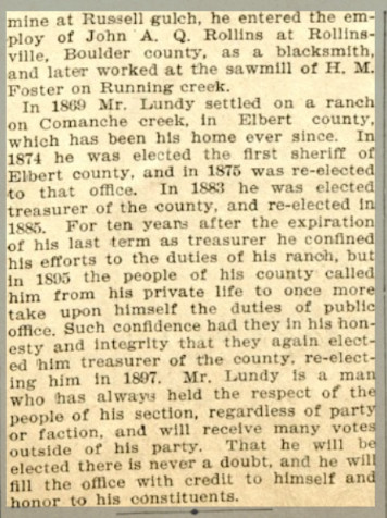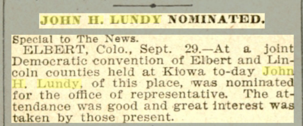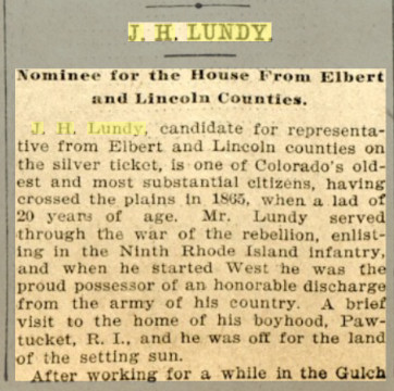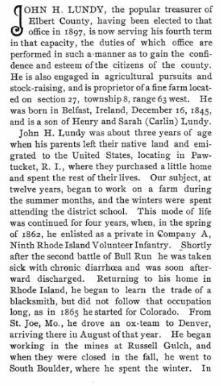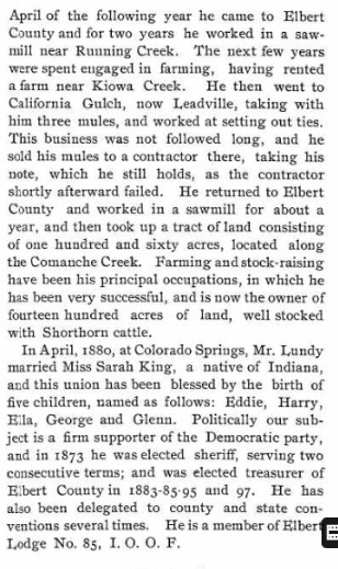 In 1880 Elbert County, Colorado, (which then extended to the Kansas border) John H. Lundy is a blacksmith, 34, born i nIreland,