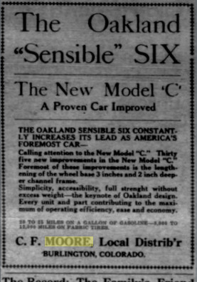 April 1919 Burlington "C. F. Moore has accepted the agency of the Oakland