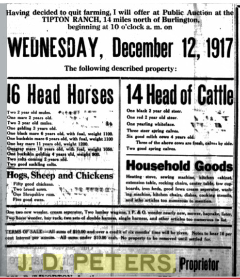 August 1915 Burlington, Colorado " J. D. Peters will Mee charge of the