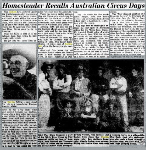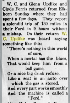 September 1934 " Mrs. Will Updike and Mrs. La Verge Cooley of Craig spent Monday at the Glen Updike home. "
