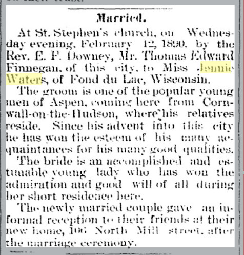 Mr. Thomas Edward Finnegan of this city to Miss Jennie Waters of Fond du Lac,