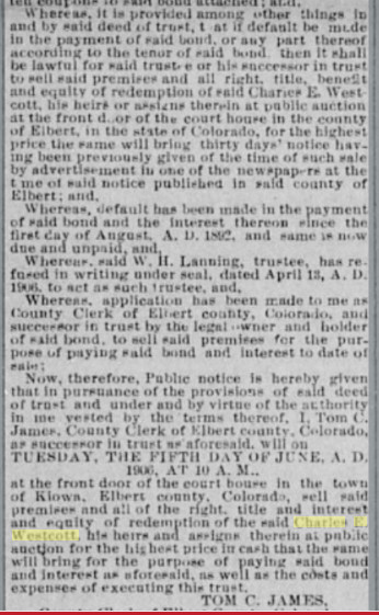 In 1923 Colorado Springs, Chas. E., a laborer, and Mary L. Westcott are living near Adams Crossing.