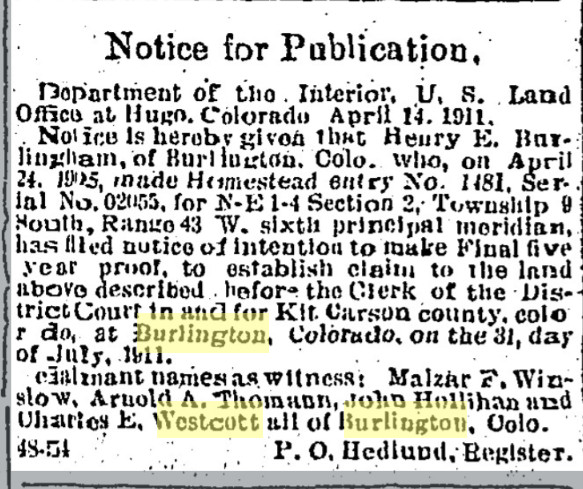 Charles claimed a quarter in section 27, 8 South 42 West, Kit Carson County, in 1890.