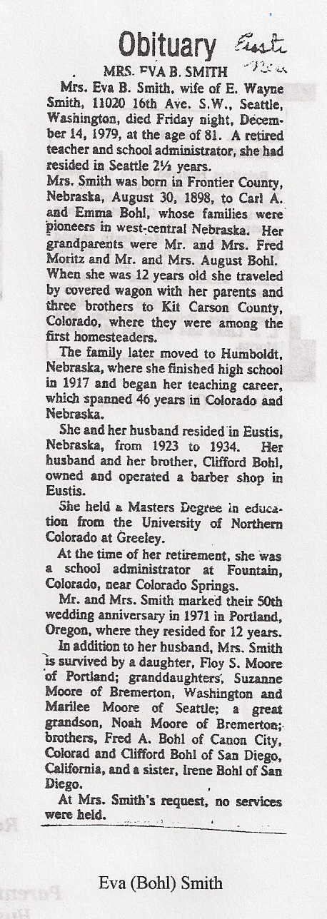 Eva Bohl, 22, married E. Wayne Smith on August 10, 1921 in Kit Carson County.