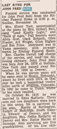 John is buried in Yuma 1876-1954 # 48448424, with Edna Agnes (Rafferty) Bohl 1896-1968 buried in Stratton, Colorado # 88113247.