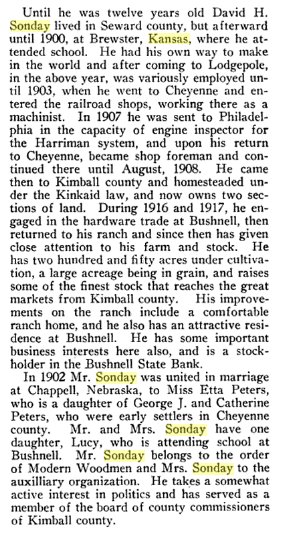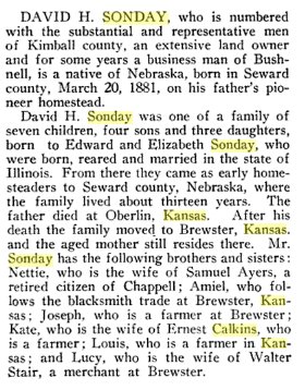 In 1898 witnesses for a land claim in ShermaCounty Kanss were Eli CALKINS, John P. Homey, and Emil D. SONDAY, all of Brewster, Kansas. So they lived near each other.