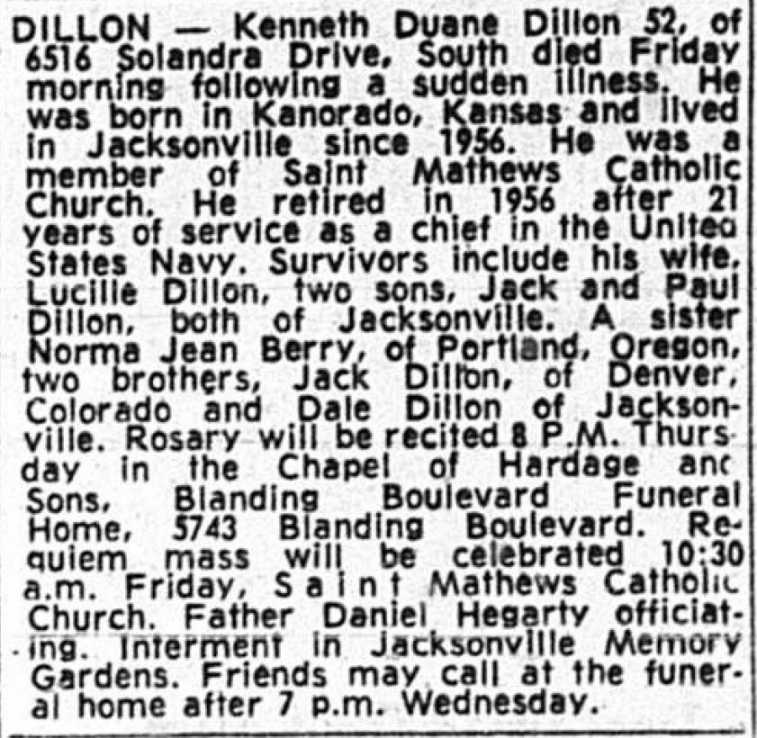 i. KENNETH DUANE DILLON, b. August 31, 1915; d. April 29, 1968.