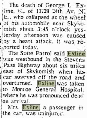 May 22, 1961 Port Angeles, Washington "George L. Exline, 61, Seattle, was found dead in his overturned car Sunday in the Stevens Pass Highway about 6 miles east of Skykomish. At Monroe General Hospital it was learned he had died of a heart attack. "