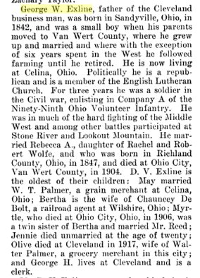 George W. Exline born June 1862 in Ohio, died July 19, 1930 in Appanoose Count, buried there # 42708331, with Alice Leona (Haptonstall) Exline 1863-1925.