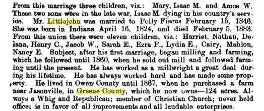 In 1850 Owen County, Indiana, Messer Littlejohn is 34, Polly 24, Mary 10, Isaac M. 8, Amos W. 7, Harriet 4, Nathaniel 2, and Delana Littlejohn newborn. Rebecca Fiscus is 17.