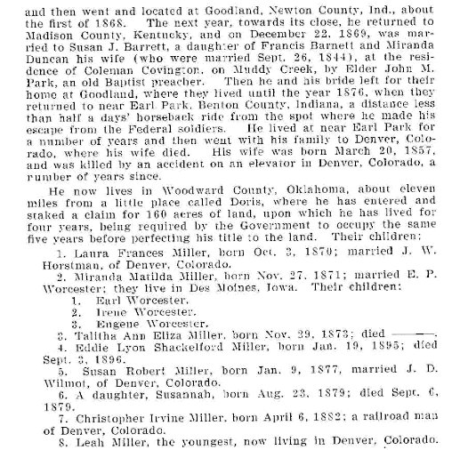 The 1925 census of Des Moines, Iowa has Eugene 63, Marinda M. 53, Ealr L. 33, Irene L. 31, and Eugene P. J. 24. Marinda's parents were Robert D. Miller and Susan J. Barnett, both of Kentucky.