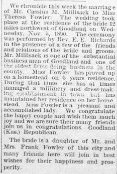 1902 Monmouth, Illinois "Mr. and Mrs. Frank Fowler will leave for Goodland, Kan., this evening for a visit with their daughters, Mrs. C. M. Millisack and Miss Julia Fowler. "