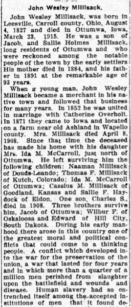 John W. Millisack 1827-1915 is buried in Ottumwa, Iowa # 20666062,